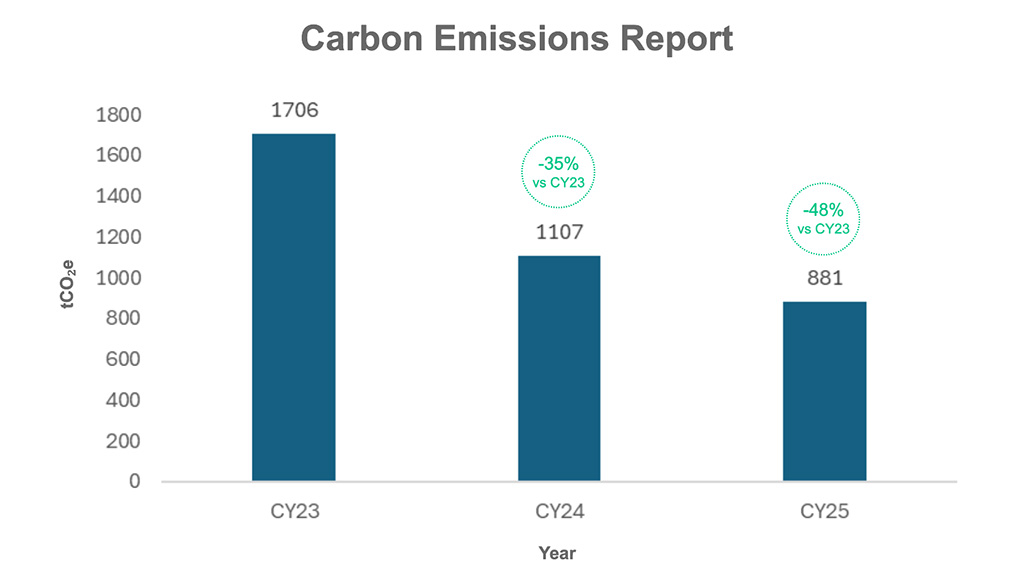- 48% reduction in carbon emissions in the past two years, decreasing from 1706 tCO₂e (2023) to 881 tCO₂e (2025)